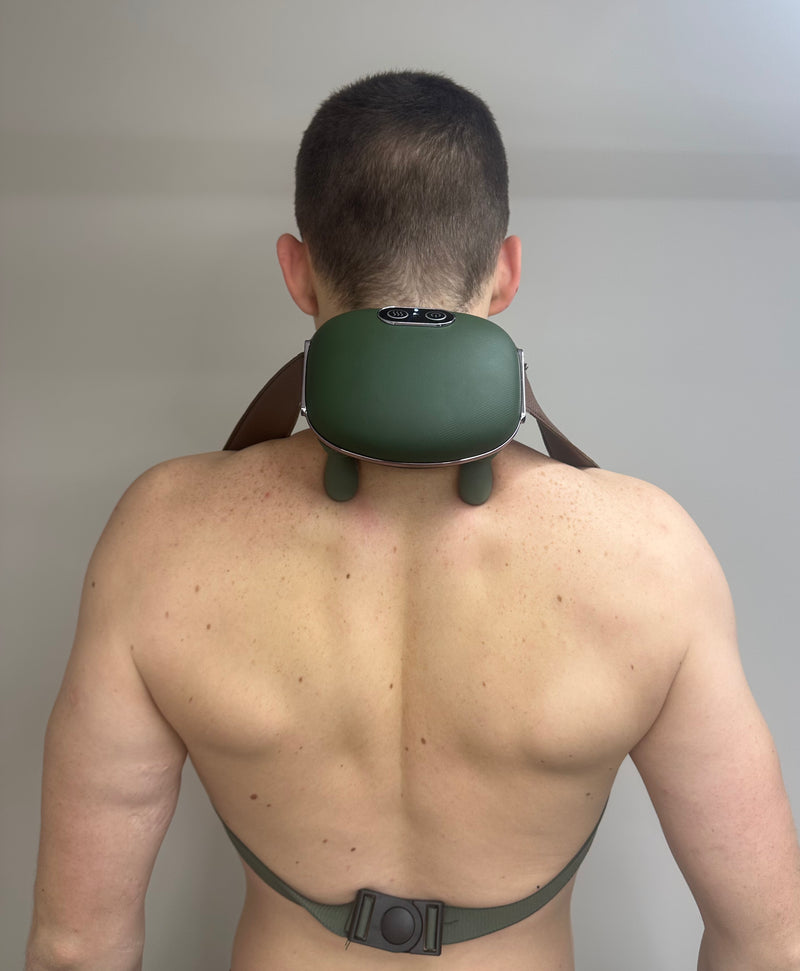 Upewnij się, że urządzenie jest naładowane przed użyciem. Zakładaj masażer zgodnie z instrukcją – tak, aby głowice masujące przylegały do szyi i ramion. Nie używaj dłużej niż 10 minut jednorazowo, aby uniknąć przeciążenia mięśni. Przechowuj urządzenie w suchym miejscu, z dala od wody i dzieci.